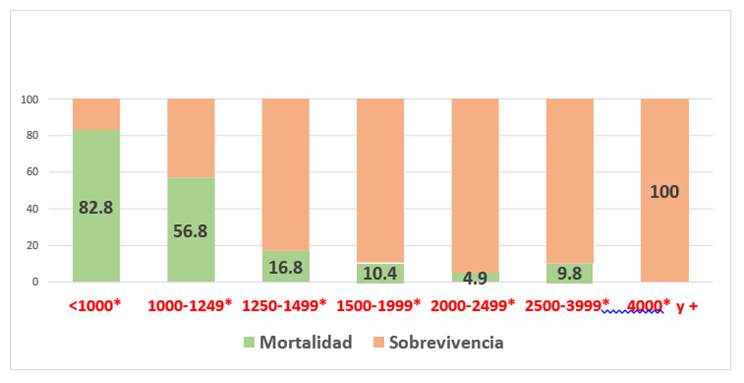 La mortalidad neonatal en los RN <1000 g fue de 82.8%, 56.8% en los RN que pesaron entre 1000 a 1249 g, 16.8% en los que pesaron 1250 a 1499 g, y siguió reduciéndose progresivamente en los grupos con mayor peso al nacer (Figura 1).