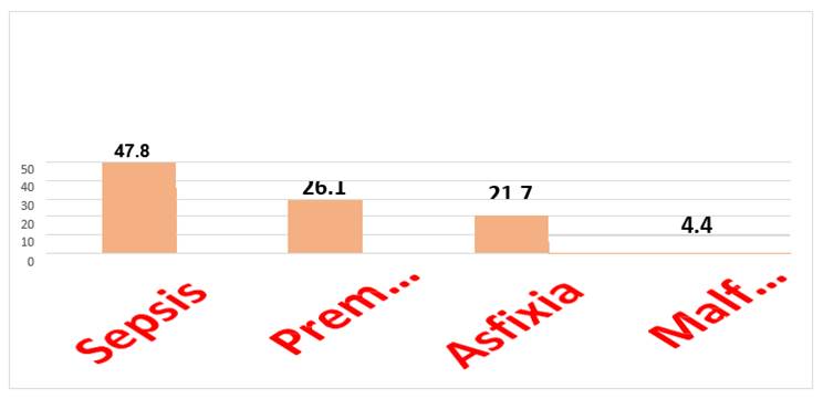 La principal causa básica de muerte entre los RN <1000 g correspondió a sepsis neonatal, con 47.8% (Figura 3). Este dato, asociado con el dato anterior del momento de mayor mortalidad, permitió inferir que las infecciones intrahospitalarias explican dichas muertes.