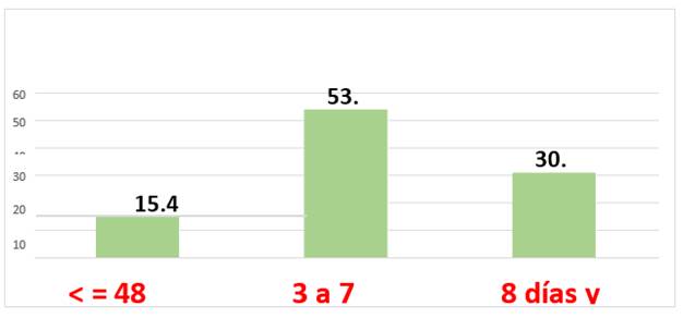 Por otro lado, la mayor mortalidad de los RN entre 1000 a 1249 g, ocurrió entre el a 7° día de hospitalización, con 53.8% (Figura 2).