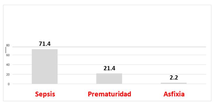 La principal causa básica de muerte entre los RN <1000 g correspondió a sepsis neonatal, con 47.8% (Figura 3). Este dato, asociado con el dato anterior del momento de mayor mortalidad, permitió inferir que las infecciones intrahospitalarias explican dichas muertes.