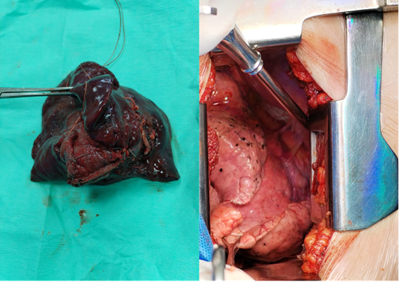 Figura 2ª. Pieza quirurgica resecada, donde se evidencia cambio en la coloración del lóbulo inferior derecho y fibrosis del parenquima. 2 a* arterias aberrantes visualizadas procedente de la arteria aortica pulmonar.