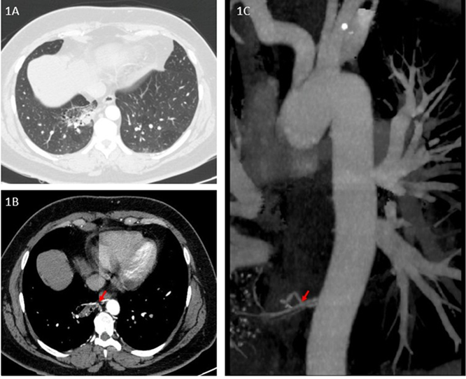 Estudios complementarios. Tomografías adicionales realizadas en hospitales de referencia nacional (enero–mayo 2024) confirmaron un área focal seudonodular en el lóbulo inferior derecho, asociada a un vaso sistémico aberrante proveniente de la aorta torácica (ver figuras 1A,1B,1C).