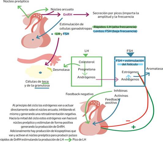 La accio´n de la GnRH sobre ce´lulas gonadotropas depende de un receptor acoplado a proteí´na G, activando segundos mensajeros como IP3, diacilglicerol y AMPc, promoviendo el ingreso y liberacio´n de calcio intracelular necesario para la exocitosis hormonal (12). El eje incluye mecanismos de retroalimentacio´n largos, cortos y ultracortos que modulan la secrecio´n hormonal, donde los esteroides ova´ricos desempen˜an un papel clave. La regulacio´n local se complementa con la inhibina, activina y folistatina, pe´ptidos derivados principalmente de las ce´lulas de la granulosa que modulan la FSH: la inhibina la suprime selectivamente, la activina la estimula, y la folistatina inhibe su accio´n unie´ndose a la activina (1).