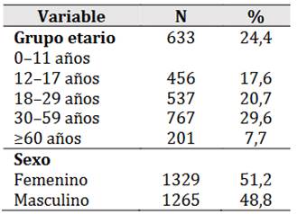 an˜os (24,4 %) y jo´venes de 18–29 an˜os (20,7 %). En menor proporcio´n se registraron casos en adolescentes de 12 a 17 an˜os (17,6 %) y en adultos mayores de 60 an˜os (7,7 %). La distribucio´n por sexo fue relativamente equilibrada, con ligera predominancia del sexo femenino (51,2 %) en comparacio´n con el masculino (48,8 %) (Tabla 1).