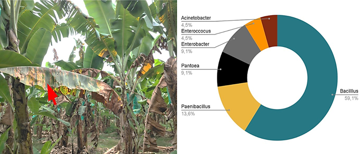En relación con otras especies bacterianas detectadas en las hojas de banano analizadas, se identificaron Pantoea spp. (9,09 %), Enterobacter spp. (9,09 %), Acinetobacter spp. (4,55 %), Paenibacillus polymyxa (13,64 %) y Enterococcus spp. (4,55 %). Según Permanasari et al. (2024), Pantoea spp. se encuentra predominantemente en el pseudotallo de banano, junto con otros microorganismos como Escherichia coli, Synechococcus spp., Pantoea vagans y Klebsiella pneumoniae. En otros estudios, como los de Dewada et al. (2024), se menciona a Priestia megaterium (actualmente clasificada como Bacillus megaterium) y Pantoea cypripedii como bacterias filosféricas con un papel en el desarrollo de las plantas, aunque su aislamiento proviene de hojas de banano sanas, lo que podría explicar su presencia en las hojas con manchas analizadas en este estudio.