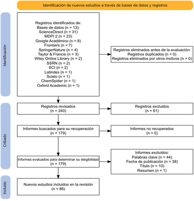 No se incluyeron artículos que no estuvieran dispo-nibles, que carecieran de una estructura de inves-tigación científica y que no contengan las variables de estudio deseadas. De los 240 artículos mediante la metodología de cribado se obtuvieron 86 artículos finales, de los cuales pertenecen 31 a ScienceDirect, 23 a MDPI, 8 a Google Académico, 7 a Frontiers, 4 a SpringerNature, 3 a Taylor & Francis, 2 Wiley Online Library, 2 a SSRN, 2 a SCI, 1 a Latindex, 1 a Scielo, 1 a ChemSpider y 1 a Oxford Academic.