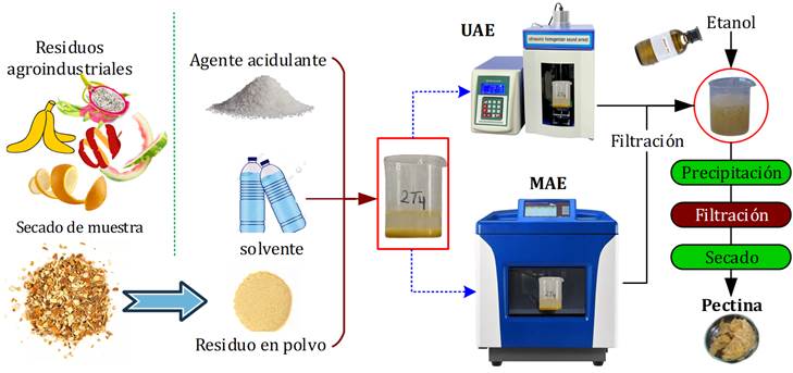 Figura 6. Diagrama general de la extracción de pectina a partir de residuos agroalimentarios utilizando tecnologías emergentes.