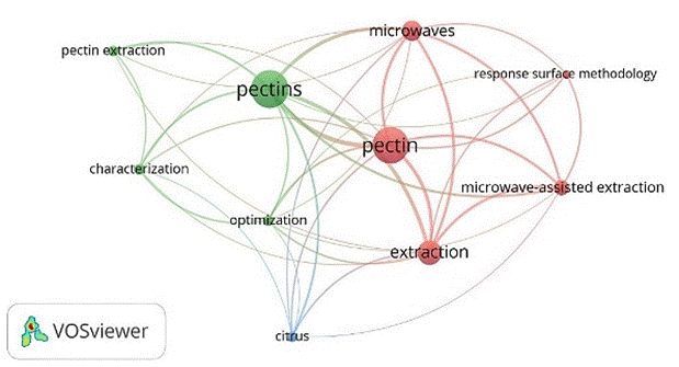 En este análisis, se destacan dos clústeres importantes (rojo y verde) (Figura 7). Clúster rojo (Extracción y Metodología): Este clúster se centra en la tecnología de extracción. Sus nodos clave son "microwave-assisted extraction", "microwaves", "extraction" y "response surface methodology". Esto indica una fuerte tendencia en la investigación hacia la aplicación y optimización de métodos avanzados para la extracción de pectina, particularmente la extracción asistida por microondas (MAE), utilizando diseño robusto como la metodología de superficie de respuesta para maximizar el rendimiento y la eficiencia de extracción.