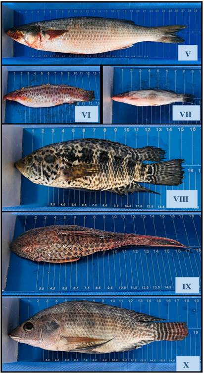 Figura 3. V Mugil cephalus (lisa). VI Trichomycterus piurae (life). VII Pimelodella yuncensis (picalón). VIII Parachromis managuensis (guapote). IX Pterygoplichtys pardalis (carachama). X Oreochromis niloticus (tilapia).