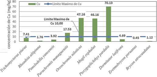 Oreochromis niloticus para cobre se reportó 47,16 mg/kg superando ampliamente el límite máximo permisible establecido de 10 mg/kg. Márquez et al. (2008) detectaron las concentraciones para la misma especie en un rango de 1,3 - 3,2 mg/kg, Rodríguez et al. (2012) señalan que O. niloticus es uno de los peces de agua dulce, que además de su importancia en el mundo de la acuicultura, por distribuirse y adaptarse en varias regiones, también sirven como bioindicadores por ser susceptibles a la bioacumulación de los contaminantes metálicos.
