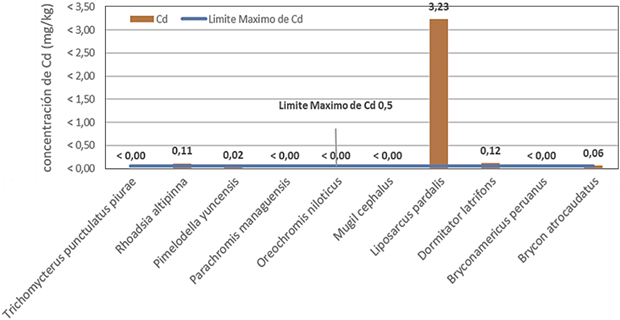 Los niveles de cadmio fueron: Brycon atrocaudatus (0,06 mg/kg); Pimelodella yuncensis (0,02 mg/kg); Dormitator latifrons (0,12 mg/kg); Pterygoplichthys pardalis (3,23 mg/kg); Rhoadsia altipinna (0,11 mg/kg), las últimas tres especies superaron el límite máximo permisible.