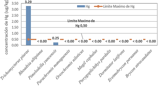Los niveles de mercurio para las especies fueron: Trichomycterus piurae (3,29 ug/kg) que sobrepasó el límite máximo permisible y Pimelodella yuncensis (0,25 ug/kg).