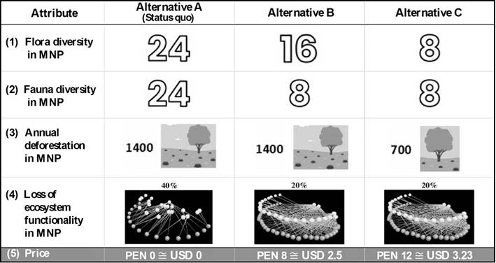 For economic valuation through choice experi-ments, inclusion of a price attribute is essential (Block et al., 2024; Notaro & Grilli, 2023; Omori et al., 2022). Accordingly, this study proposes a monthly monetary contribution, over a one-year period, to finance specific actions aimed at reducing environmental impacts that cause biodiversity loss in the MNP. The status quo for the flora and fauna diversity corresponds to 24 endangered plant and animal species in the MNP. For annual deforestation, it represents the average annual deforestation observed in this protected area, while the ecosystem functionality attribute follows Dávila et al. (2023). Figure 2 illustrates one of the experiment formats presented to respondents, developed using an efficient choice experiment design.