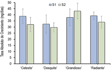 Aunque la tasa absoluta de crecimiento es similar en los cuatro cultivares evaluados, los valores promedios sugieren una tendencia hacia un crecimiento más lento en Desquite y más precoz en Grandioso.