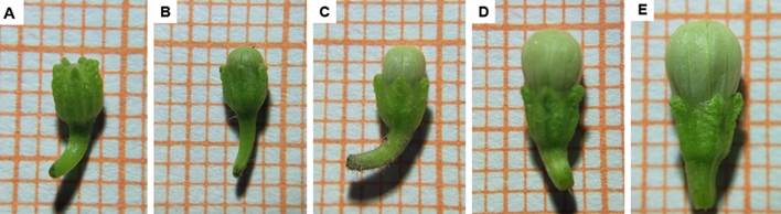 Nota: A) pimpollo con cáliz completamente cerrado, B) pimpollo con cáliz abierto y corola ligeramente pronunciada, C) pimpollo con corola ligeramente más pequeña que el cáliz, D) pimpollo con corola y cáliz de tamaño semejante y E) pimpollo con corola más grande que el cáliz.