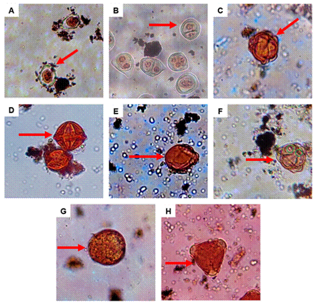 Nota: A) célula madre, B) Díada, C) Tétrada, D) Microspora uninucleada, E) Microspora vacuolada o uninucleada tardía, F) Microspora binucleada, G) Polen inmaduro) y H) Polen maduro.