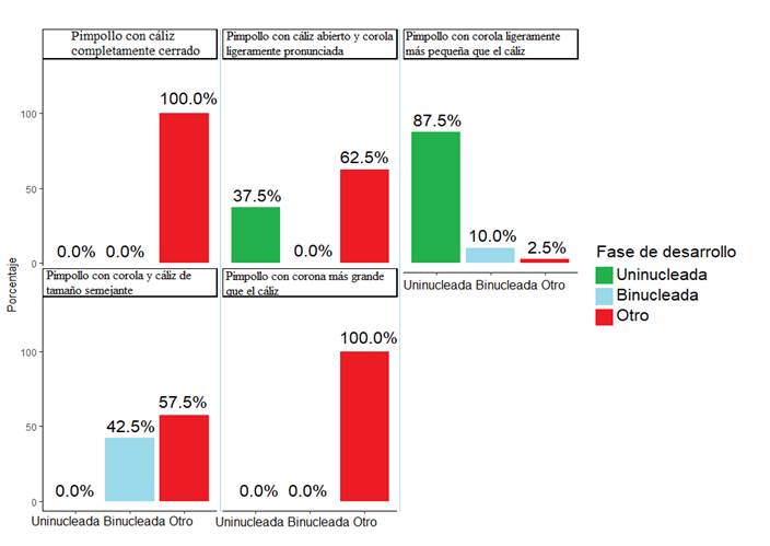 En relación a los resultados obtenidos en la Tabla 1 y la Figura 2, se puede observar que la aparición de la microspora uninucleada y binucleada se presentó en la fase de desarrollo de los pimpollos florales de Capsicum chinense "ají mochero" B: Pimpollo con cáliz abierto y corola ligeramente pronunciada cuyo porcentaje de representación fue de 37,5% (15 unidades) de microspora uninucleada, además también en la fase C: Pimpollo con corola ligeramente más pequeña que el cáliz, el porcentaje ascendió al 87,5% (35 unidades) de microspora uninucleada y del 10,0% (4 unidades) de microspora binucleada, así también en la fase D: Pimpollo con corola y cáliz de tamaño semejante, con el 42,5% (17 unidades) de microspora binucleada, de modo tal que podemos afirmar que la fase de desarrollo de los pimpollos florales de Capsicum chinense "ají mochero" donde se registró el mayor porcentaje acumulado de microspora uninucleada y binucleada fue en la fase C: Pimpollo con corola ligeramente más pequeña que el cáliz (Parra et al., 2013).