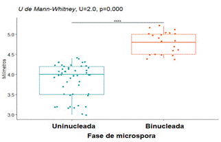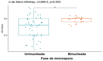 Figura 5. Diagrama de Cajas y bigotes (Boxplot) con prueba de U de Mann Whitney para la comparación del diámetro de pimpollos florales de C. chinense "ají mochero", de la fase microspora uninucleada con binucleada.