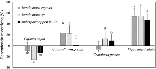 Nuestros resultados muestran que los HMA contribuyen a mejorar la absorción de nutrientes y por tanto el incremento de la biomasa de las plantas, la cual varía en función de la dependencia de estas con el tipo de HMA con el cual establecen la simbiosis. Nagaraj et al. (2021) encontraron que la dependencia de las plantas varió significativamente entre los genotipos de C. cajan oscilando entre 30,54% y 65,02%, lo cual contribuyó a generar mayor biomasa en plantas micorrizas. Por el contrario, en nuestro estudio no se observó dependencia de esta leguminosa con ninguno de los HMA utilizados como inoculantes, más aún tuvo una dependencia negativa (Figura 2). Sin embargo, C. ensiformis presentó dependencia con A. rugosa (23,32%), Acaulospora sp. (22,01%) y muy baja con A. appendicula (0,71%). Así mismo, C. juncea presentó dependencia con los hongos Acaulospora sp. (12,71%) y A. appendicula (9,04%). Por su parte, V. unguiculata fue la que mayor dependencia micorrízica presentó, alcanzando con A. rugosa 53,86%, con Acaulospora sp. 54,40% y con A. appendicula 47,37% (Figura 2).