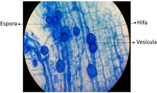 Figura 3. Estructuras de colonización micorrízica en leguminosas de cobertura. Se observa la presencia de hifas, esporas y vesículas.