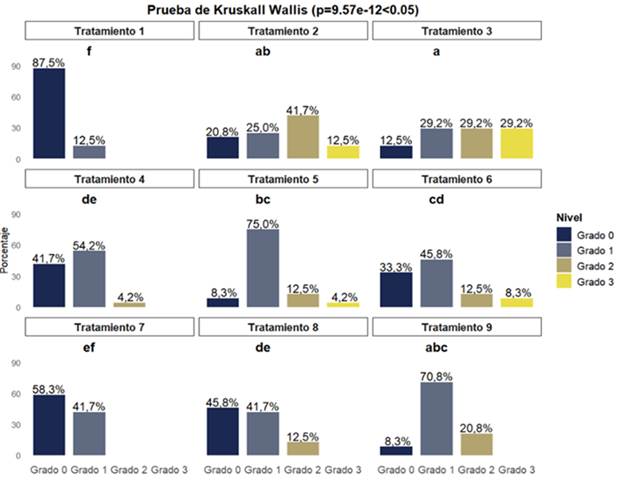 Figura 2. Barras apiladas de los porcentajes de callos obtenidos según la escala de Santana (grado de formación) por el estudio sobre el efecto del 2,4-Diclorofenoxiacético a partir de subcultivo de callos de Ladenbergia oblongifolia ¨árbol de la quina¨. Nota: Los tratamientos con letras diferentes son significativamente diferentes según la prueba de comparaciones múltiples de Dunn (p < 0,05).