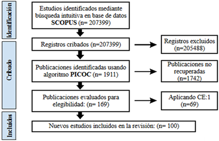Tras una búsqueda exhaustiva en la base de datos SCOPUS, utilizando el diagrama PRISMA y aplicando los criterios de inclusión y exclusión detallados en la Tabla 2, se seleccionaron 100 artículos para la presente revisión. Este conjunto final de estudios se obtuvo a partir de un total inicial de 207,399 docu-mentos. Posteriormente, se registró la metodología PICOC junto con los criterios de inclusión (CI1, CI2, CI3, CI4, CI5, CI6) y exclusión (CE1), generando el resultado final que se presenta en la Figura 4.