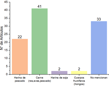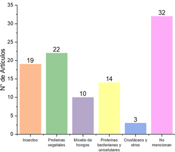 En cuanto a microorganismos, Chama et al. (2021) encontraron que la harina bacteriana de Methylococcus capsulatus mejora la respuesta inmune en tilapia, mientras que Gregersen et al. (2022) señalaron limitaciones en la calidad proteica de algas, requiriendo mejoras en los métodos de extracción. Finalmente, en acuicultura, Montalbán et al. (2023) y Hussain et al. (2022) demostraron que las proteínas alternativas, como las de gusanos de harina y vegetales, mejoran la conversión alimenticia y el crecimiento en peces y camarones, aunque reconocieron desafíos técnicos en la digestibilidad de fuentes no convencionales. Tefal et al. (2023) observaron que combinaciones de harinas orgánicas e insectos mejoran la salud y el crecimiento en lubinas orgánicas, mientras que Delmaine et al. (2024) investigan el uso de proteínas de tunicados en acuicultura, subrayando su impacto positivo en la composición lipídica de los peces.