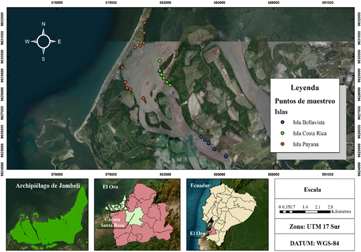 En la zona costera de la provincia de El Oro, en el sector meridional del Golfo de Guayaquil en Ecuador, se encuentra el archipiélago de Jambelí (Reynaud et al., 2018). Se localiza entre las coordenadas 3°21′56,02″ S y 80°6′38,88″ W. Esta unidad geográfica abarca aproximadamente 300 km² y está compuesta por un conjunto de islas e islotes de alto valor ecológico (Zhiminaicela-Cabrera et al., 2020). En su territorio confluyen ecosistemas clave como manglares del sistema Jama-Zapotillo, cuerpos de agua intermareales y zonas transformadas para actividades humanas. Los suelos predominan con texturas arcillo-limosas y franco arcillo-limosas, que los hacen aptos para usos agrícolas, acuícolas, camaroneros y turísticos (Morante et al., 2012; Sagot Valverde, 2022; Zhiminaicela-Cabrera et al., 2020).