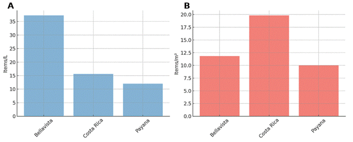 La presencia de colores variados en Payana (blanco, amarillo) sugiere aportes de plásticos fragmentados (envases, bolsas), mientras que la uniformidad en Costa Rica y Bellavista apunta a fuentes más localizadas. La ausencia de colores como verde o naranja en agua refuerza que estos tonos son más comunes en sedimentos, donde se acumulan partículas degradadas (Kholis et al., 2025).