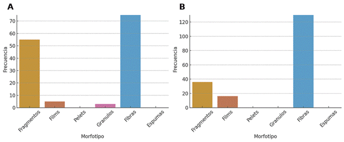 Figura 6. Distribución de colorimetría de microplásticos en agua (A). Distribución de colorimetría de microplásticos en sedimentos (B).