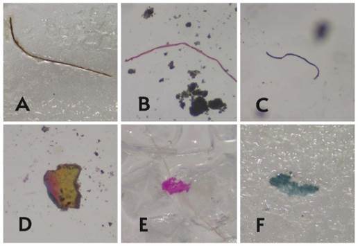 Las imágenes ilustran la diversidad morfológica y cromática encontrada, incluyendo fibras de distintos colores (A, B y C), fragmentos con tonalidades multicolores (D) y vívidas como fucsia (E) y azul (F), lo que refleja la complejidad en el origen de estos contaminantes. Estas evidencias visuales permiten confirmar las categorías establecidas por Kovač Viršek et al. (2016) y refuerzan la importancia de la observación microscópica en la caracterización de los microplásticos presentes en ambientes costeros.