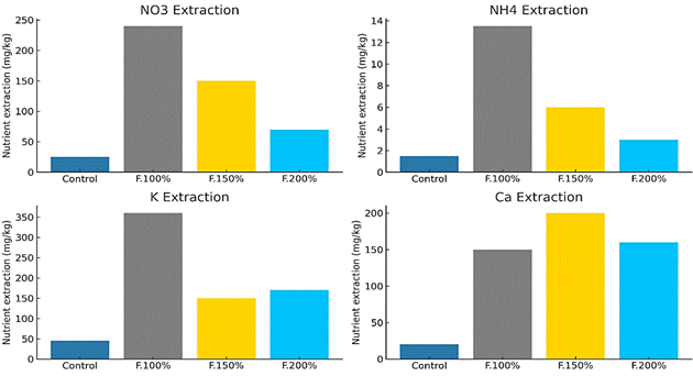 The study on the nutritional status of the Roselle crop showed that fertilization significantly impacts nutrient absorption, especially in the third development stage. Considering that the recommended dose is 100% fertilization in Kg Ha-1 (425 Urea; 130.43 DAP; 175 MOP; 211.04 CaSO4; 130 MgSO4), the 150% dose optimized the extraction of NO3- in leaves and petioles, while the 200% dose maximized the extraction of NH4+ and K+ in stems and fruits. However, the research determines that the optimal dose corresponds to 100% of the recommendation, as higher levels do not show proportional improvements in total nutrient extraction. These results demonstrate the importance of maintaining balanced fertilization management, as excessive doses can cause nutritional imbalances and reduce absorption efficiency, compromising the sustainability of the crop.
