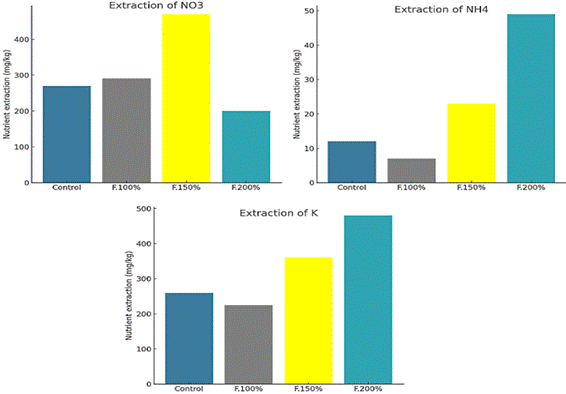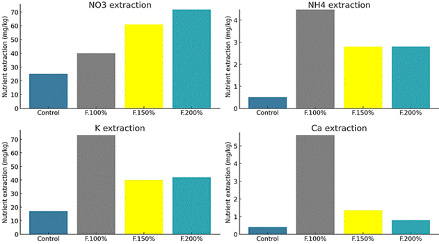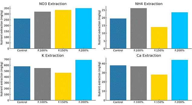 A Completely Randomized Block Design (CRBD) was used, with four treatments and four replica-tions, for a total of 16 experimental units. Each unit consisted of four plants, totaling 64 plants for the experiment. Treatments were defined as follows: Treatment 1 was the unfertilized control (SF); Treatment 2, full fertilization (F. 100%); Treatment 3, 50% more than the recommended dose (F. 150%); and Treatment 4, 100% more than the recommended dose (F. 200%).
