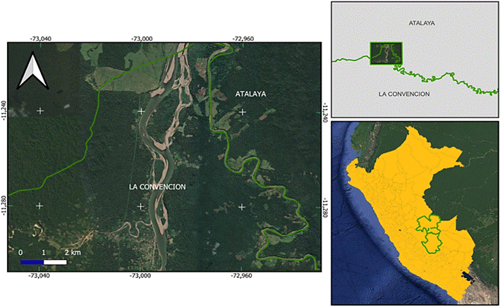 El estudio se localizó entre la provincia de Atalaya y La Convención, ubicada en la región Ucayali, el proyecto se realiza en las coordenadas geográficas -73,00° y -11,20°, de longitud y latitud, respec-tivamente (Figura 1).