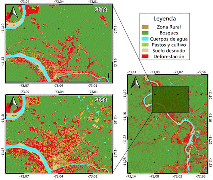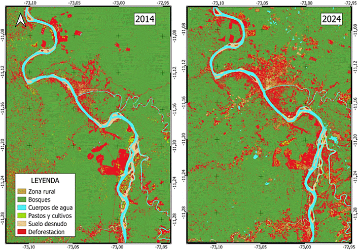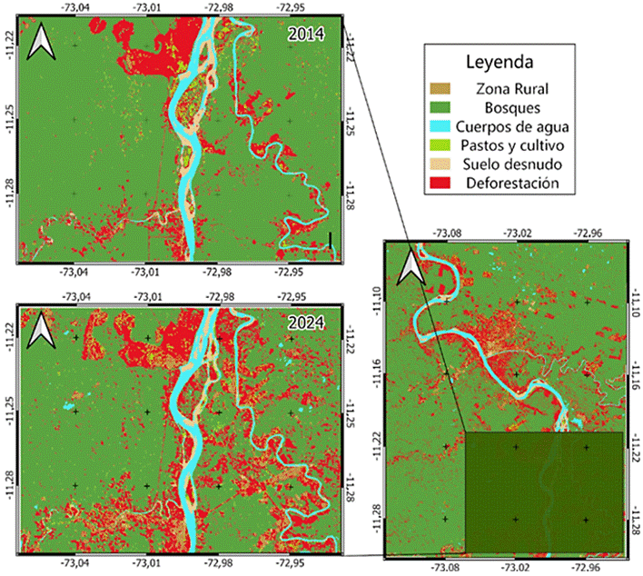 La Figura 2 muestra el mapa comparativo de la zona de estudio para los años 2014 y 2024, basado en una clasificación supervisada del uso de la tierra. La imagen utiliza datos satelitales para ilustrar la distribución espacial de diferentes categorías de uso de la tierra, codificadas por colores: zona rural (marrón oscuro), bosque (verde oscuro), cuerpos de agua (celeste), pastos y cultivos (verde claro), suelo desnudo (marrón claro) y deforestación (rojo).