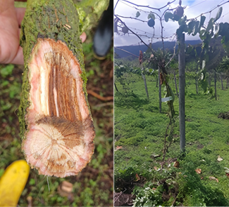 A plant infected by F. solani under field conditions typically exhibits progressive symptoms such as yellowing, flaccidity, or foliar wilting, which are characteristic of the disease (Hoyos-Carvajal & Castillo Corredor, 2015). When the infection occurs in the central root or stem region, it may advance internally without any visible damage to the outer layers or wood bark. External symptoms appear later as the fungus ascends through the xylem, rapidly colonizing vascular bundles until the plant dies (Tamayo, 1999).