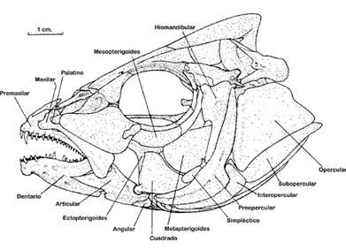 Figura 2. Cráneo de Lutjanus griseus (Tomado de Kobelkowzky, 1998).