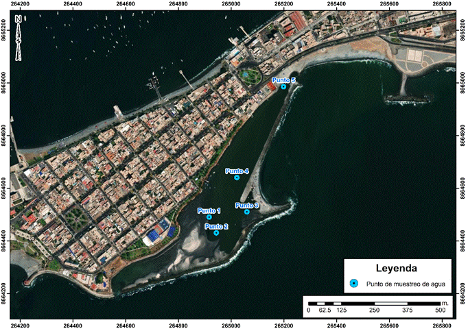Figura 1. Distribución espacial de los puntos de muestreo en la Poza La Arenilla, La Punta, Callao. Los cinco puntos de muestreo fueron seleccionados para cubrir diferentes zonas del humedal artificial. Las coordenadas están expresadas en sistema UTM WGS 84.