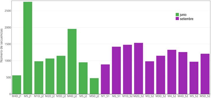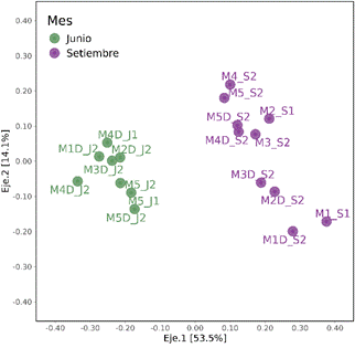 Los muestreos se realizaron en dos meses del año, junio y septiembre de 2024. Para garantizar la calidad y reproducibilidad de los resultados, también se realizaron réplicas técnicas (dos eventos de secuenciación) para cada periodo: