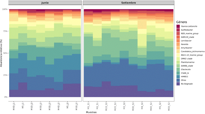 En el presente estudio se documentan cambios significativos en la diversidad y composición bacte-riana entre junio y septiembre, con mayor riqueza taxonómica y predominio de diferentes géneros según la estación. Esto sugiere que, al igual que en el estudio de Wei et al., las variaciones estacionales en parámetros ambientales, especialmente tempe-ratura y oxigenación, influyen decisivamente en la estructura de las comunidades microbianas, lo que estaría correlacionado con las fluctuaciones esta-cionales en factores fisicoquímicos que modulan la composición bacteriana, un fenómeno consistente tanto en ecosistemas naturales como artificiales.