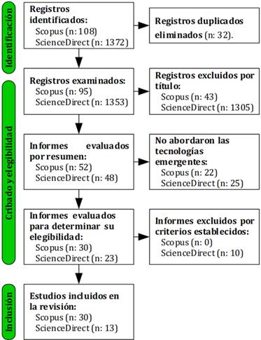 La investigación sistemática se llevó a cabo siguiendo la metodología PRISMA (Quispe et al., 2021). La información se recopiló en abril de 2025 a partir de las siguientes bases de datos: Scopus y Science Direct, utilizando términos clave como: waste, pectin, microwave, supercritical and ultrasound, junto a operadores boleanos (AND, OR).