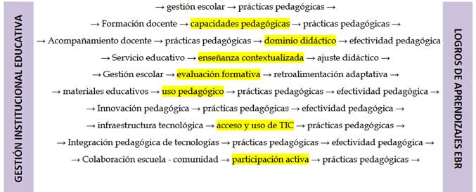 Entre el tramo GIE – PP se ha identificado y plantea: la gestión del currículo, el clima institucional, la convivencia escolar, la gestión de los recursos escolares, el monitoreo y la evaluación (desde la GIE), y recién un poquito de articulación externa (más hacia el siguiente eslabón). Las practicas pedagógicas en sí, también tienen sus propias condicionantes (lo cual, no ha sido objeto de la presente investigación). Y entre el tramo vinculante de las PP a los LA, se han identificado seis (6) condicionantes: la planificación curricular, el uso de estrategias pedagógicas, la evaluación formativa y su retroalimentación, la gestión del clima y cultura en el aula, la gestión del tiempo neto de enseñanza, y la capacidad docente reflexiva y aplicativa, muy importante para pasar de la enseñanza a los logros de aprendizajes (Ovalle-Saldarriaga & Lino-Ovalle, 2024; Armas-Rebaza, 2024; Banco Interamericano de Desarrollo & Banco Mundial, 2024).