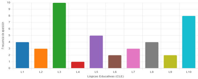 El siguiente gráfico (2) visualiza la distribución de las lógicas educativas, proporcionando una herramienta clara para identificar prioridades en la investigación sobre logros de aprendizaje en EBR. Las frecuencias se derivan del énfasis en el resumen de cada artículo indexado revisado, donde L3 (prácticas pedagógicas → logros) y L10 (gerencia institucional para equidad) son las más mencionadas, seguidas por L5, L1, L2, L7, L8, y con menor frecuencia L4, L6, L9.