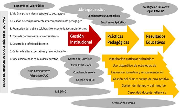 La Gestión Institucional Educativa (GIE) está centrada en el cumplimiento normativo del Ministerio de Educación (MINEDU), presenta limitaciones en su capacidad para asegurar la causalidad de los resultados. Esta investigación propone un Modelo de Gestión Institucional Educativa (MGIE) basado en el Gerenciamiento por y para Resultados (GPxPR), cuyo objetivo es transformar la administración escolar en una función gerencial de efectividad. Mediante una Trayectoria Investigativa Secuencial (TIS), que incluyó la sistematización de prácticas y un estudio cualitativo hermenéutico-interpretativo en 20 centros, se estructuró el Corpus de Lógicas Educativas (CLE), identificando 21 factores asociados y 41 tramos vinculantes que componen la Cadena de Valor Educativa (CVE). El MGIE integra este marco causal con el Instrumental Administrativo Adaptativo (CAA7), el cual permite al director/a diagnosticar el estado exacto de las condicionantes gestionables (en seis niveles: de Nulas a Desarrolladas). Se concluye que el MGIE es complementario al marco normativo vigente, al dotar al Liderazgo Directivo Gerencial de la herramienta necesaria para administrar la causalidad y desplegar medidas adaptativas y pertinentes, asegurando que las Prácticas Pedagógicas, especialmente la Evaluación Formativa y Retroalimentación, se traduzcan directamente en el incremento de los Logros de Aprendizajes (LA).