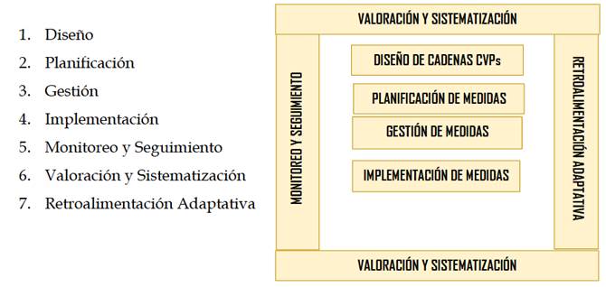 Se propone un ciclo administrativo de siete pasos: diseño, planificación, gestión, implementación, monitoreo y seguimiento, valoración y sistematización, y la retroalimentación adaptativa.