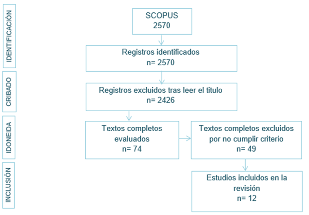 De los 2570 estudios encontrados inicialmente en la base de datos, se seleccionaron los siguientes: 49 leyendo el título y el resumen. De ellos 74 fueron excluidos después de leer los artículos completos. Por lo tanto, los estudios que serán incluidos en la revisión del artículo serán 12 por cumplir con todos los criterios de selección. (Figura 1)